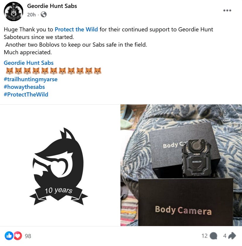 One of the groups we have supported before and are happy to support again is the Geordie Hunt Saboteurs (GHS) who “are here to save animals.” They regularly sab the Consett-based Braes of Derwent who just this month were “observed and filmed actively chasing and hunting the hounds onto a fox”.